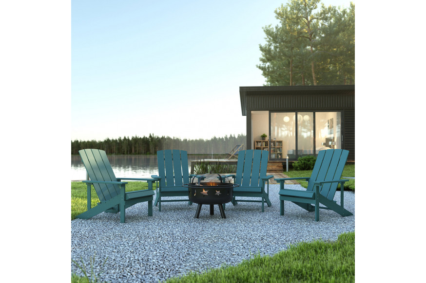 Take a break from the pressures of everyday life and find the perfect relaxation spot with this set of 4 commercial grade colorful sea foam adirondack lounging chairs and star and moon fire pit bundled set. This lounger has a wide back, slanted seat and wide arms so you can enjoy the outdoors in comfort. Constructed of weather-resistant polystyrene, the wood-like substance was designed to hold up in many environments and can be cleaned with a damp cloth. Chair has a vertical lattice back and is also UV protected and designed for outdoor use. Grab your flip flops and favorite swimsuit cover during summer evenings or a big bag of marshmallows, that superbly comfy sweatshirt and blanket when the leaves turn. This 4 chair and fire pit set gives you the perfect area for year round get togethers. The moon and stars in the sky won’t be the only ones you see with this black outdoor wood fire pit. This gorgeous piece has moon and star mesh cutouts on the sides that provide ventilation for continual burning while adding charm with a bit of whimsy to your backyard. This fire pit has an attractive finish and comes with a mesh top to prevent sparks from escaping. This round backyard fire pit is made of iron for long lasting durability and has a high temperature coating that will look great season after season. Assembly takes less than 10 minutes for each chair so you can get down to the business of relaxing. Make great memories at home, the beach or at the campground with this fire pit and 4 chair combo.