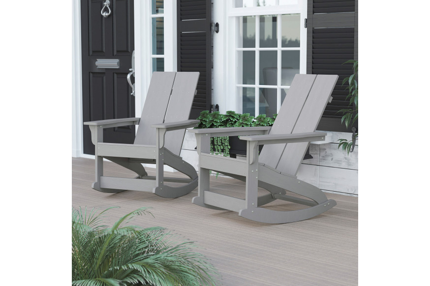A new twist on a classic design brings you this set of 2 commercial grade modern adirondack rocking chairs ideal for a day on your front porch, deck, or sunroom. This rocking lounge chair has an extra wide supportive back and slanted seat and armrests that relieve tension from the neck and shoulders for ultimate comfort. The polystyrene resin composition mimics the look of wood while vertical dual slat back lends a casual sophistication to any decor indoors or out. Constructed of weather-resistant polystyrene, and UV treated, this backyard chair was designed to hold up in many environments and is strong enough to accommodate users up to 350 pounds. With no sanding, painting, or sealing, these traditional chairs, maintenance is simple and they won’t rot, peel, or splinter making it ideal for the hospitality industry. Cleanup is easily accomplished with a damp cloth to maintain appearances and assembly takes less than 30 minutes with the included materials. These all-weather adirondack chairs are ideal around the firepit and will add timeless elegance to any indoor or outdoor space.