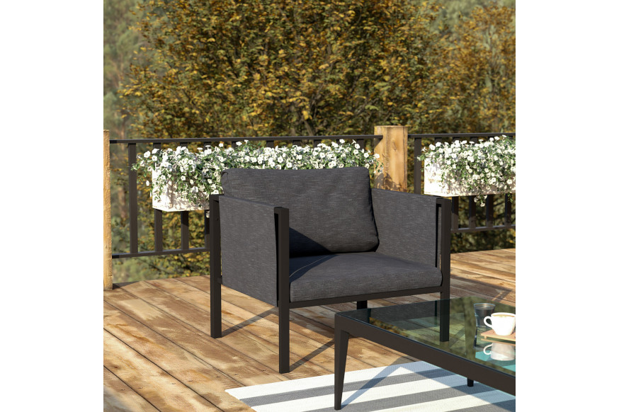 Entertain friends and family on the deck or patio and meet outdoors with clients in upmarket style when you purchase this stylish patio chair. Boasting a black metal frame with included charcoal back and seat cushions as well as storage pockets, everything you need for ultimate relaxation is in the box. This upholstered all-weather lounge chair with storage will add sophisticated comfort to any residential or commercial atmosphere. Whether you’re taking a break from a long day or having after work drinks with your business partners, this comfortable lounge chair offers enduring materials. A powder coated 18 gauge steel frame is weather-resistant to withstand the rigors of year-round use however, care should be taken to protect from prolonged periods of wet weather. Sturdy metal screw reinforcements allow this chair to hold up to 300 lbs. of static weight to accommodate most users. Storage pockets on both sides of this multipurpose chair allow you to keep remote controls, reading glasses, or informational pamphlets within reach. Assemble your new patio chair in 30 minutes or less with included materials. Durable fabric cushions are zippered for removal and may be spot cleaned with water and a dry cloth. Fixed plastic floor glides protect your hard flooring surfaces when used indoors. Purchase several of these indoor/outdoor patio chairs to create conversation areas for meetings or a relaxed space for the whole family to gather.