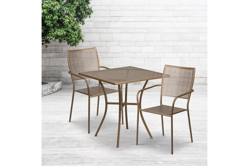 Brighten up your patio space with this beautiful patio table set. This colorful set will enhance your bistro, cafe, restaurant, hotel or home patio space. The patio chairs stack for storing. The frames are designed for all-weather use making it a great option for indoor and outdoor settings. For longevity, care should be taken to protect from long periods of wet weather. The possibilities are endless with the multitude of environments in which you can use this table, for both commercial and residential spaces.