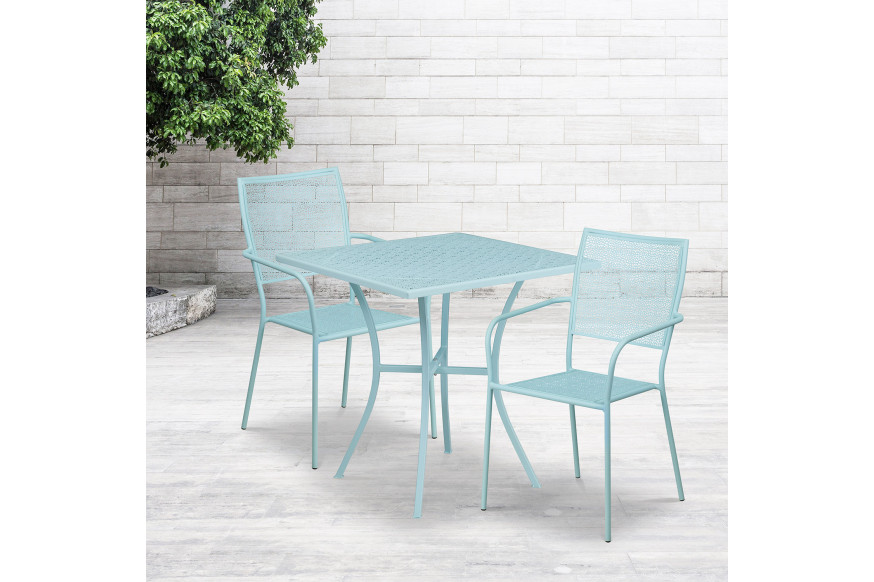Brighten up your patio space with this beautiful patio table set. This colorful set will enhance your bistro, cafe, restaurant, hotel or home patio space. The patio chairs stack for storing. The frames are designed for all-weather use making it a great option for indoor and outdoor settings. For longevity, care should be taken to protect from long periods of wet weather. The possibilities are endless with the multitude of environments in which you can use this table, for both commercial and residential spaces.