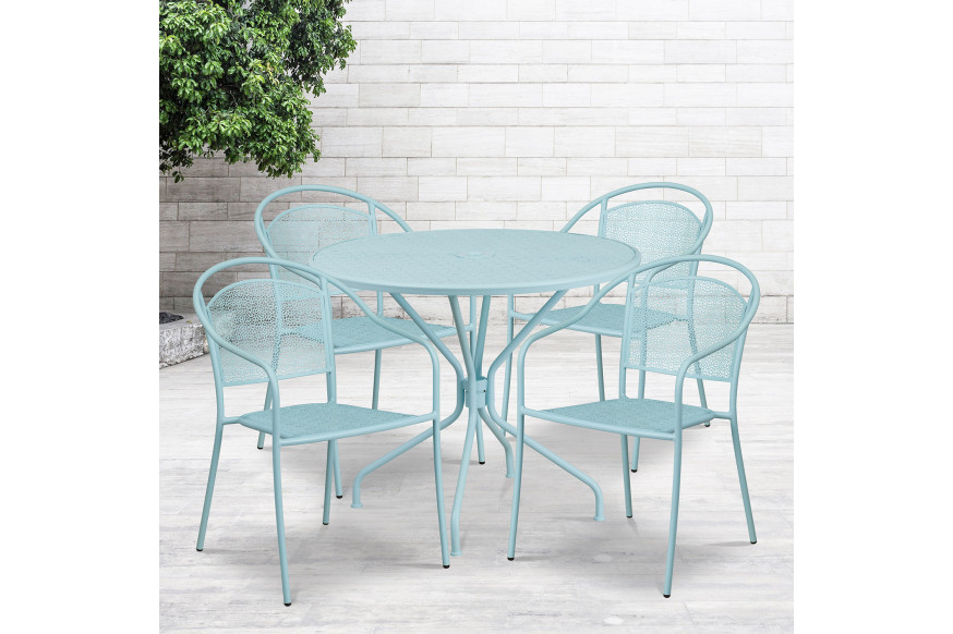 Brighten up your patio space with this beautiful sky blue rain flower design patio table set. This colorful set will enhance your bistro, cafe, restaurant, hotel or home patio space. The round top table includes an umbrella hole (umbrella not included). Purchase your desired umbrella to shield you from the sun and put your personal stamp on your look. The patio chairs boast a gently curved back and integrated arms for comfort. For convenience, these chairs stack up to 8 high for storing. The frames are designed for all-weather use making it a great option for indoor and outdoor settings. For longevity, care should be taken to protect from long periods of wet weather. No matter where you put it, this table and chair set will be perfect in any setting including both commercial and residential spaces.