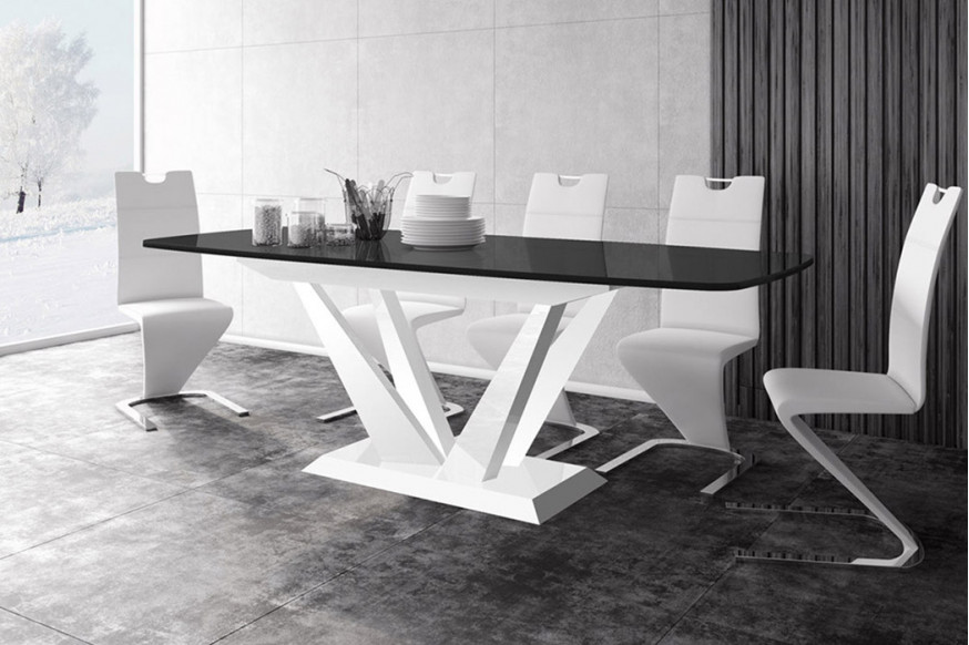 Fetto Dining Set With 6 Chairs by Maxima. This model is available in Black/White Table/White Chairs color.FETTO Dining set immediately attracts attention by its simplicity and combination of White and Black colors. The original base and a modern high gloss table top make FETTO Dining table and chairs a stylish and sophisticated accent of your dining/living room or even office. In addition to its modern design, the table also features a practical folding function. You can easily get 82 inch or even 100.8 inch from the standard length of 63 inch. The set includes: 1 Dining Table + 6 chairs. Dining Table crafted from MDF in high gloss finish. Extendable table top, 2 extension leaves included. Chairs: Chrome steel legs, FauLeather Upholstery. Dimensions: Table 29.5″ H 63″ (82-100.8)” L 35″ D, Chair: 39.7″ H 18″ W 24.8″ D